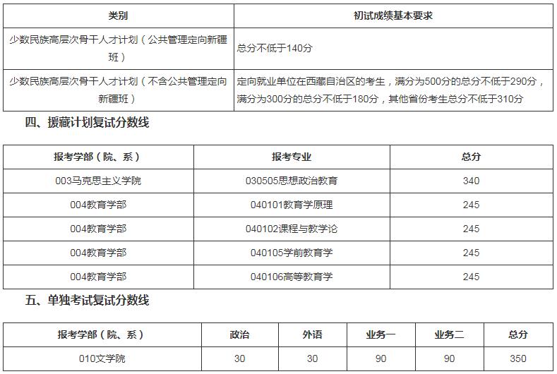 說明:此復(fù)試基本分?jǐn)?shù)線只是我校復(fù)試的最低分?jǐn)?shù)要求,接受報(bào)考的學(xué)部院系可根據(jù)整體考試情況、招生計(jì)劃、學(xué)科專業(yè)特點(diǎn)等,上調(diào)分?jǐn)?shù)要求。考生須同時(shí)達(dá)到學(xué)校復(fù)試基本分?jǐn)?shù)線和報(bào)考學(xué)部院系調(diào)整設(shè)定的復(fù)試分?jǐn)?shù)線,才有資格參加復(fù)試。學(xué)部院系調(diào)整設(shè)定的復(fù)試分?jǐn)?shù)線和復(fù)試辦法,另行通知。