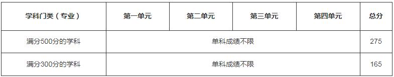 單科成績(jī)不限,總分不低于對(duì)應(yīng)統(tǒng)考的學(xué)科門(mén)類(lèi)(專(zhuān)業(yè))學(xué)校分?jǐn)?shù)線(xiàn)的90%(四舍五入取整)。