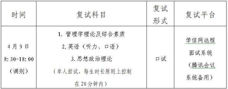 (三)復(fù)試成績以 100 分為滿分,計算方式如下:復(fù)試成績=管理學(xué)理論及綜合素質(zhì)成績×60%+英語(聽力、口語)×20%+思想政治理論成績×20%。