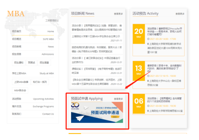 (https://cob.sufe.edu.cn/MBA)點(diǎn)擊“預(yù)面試網(wǎng)申通道”(如紅框所示)進(jìn)入。